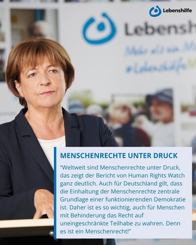 💬 „Weltweit sind Menschenrechte unter Druck, das zeigt der Bericht von Human Rights Watch ganz deutlich. Auch für Deutschland gilt, dass die Einhaltung der Menschenrechte zentrale Grundlage einer funktionierenden Demokratie ist. Daher ist es so wichtig, auch für Menschen mit Behinderung das Recht auf uneingeschränkte Teilhabe zu wahren. Denn es ist ein Menschenrecht!"