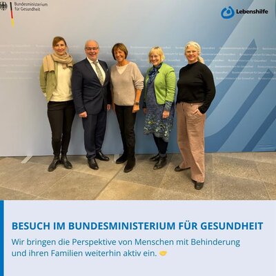 📸 (Auf dem Foto von links nach rechts: Lilian Krohn-Aicher, Referentin der Lebenshilfe; Staatssekretär Dr. Georg Kippel; unsere Bundesvorsitzende Ulla Schmidt; unsere Geschäftsführerin Prof. Dr. Jeanne Nicklas-Faust und unsere Justiziarin Antje Welke.)