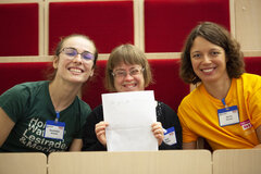Selfadvocat (Selbstvertreterin) Sara Pickard (Mitte) aus Großbritannien beim Selbstvertreter-Kongress der Lebenshilfe. Bildquelle bitte nennen: Lebenshilfe / C. Doeller, B. Proschak. -